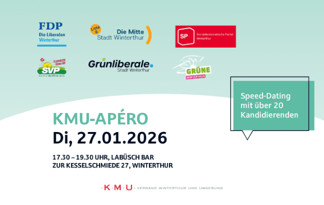 Dienstag, 27. Januar 2026 KMU-Apéro mit Kandidierenden-Speeddating17.30 Uhr bis 19.45 Uhr, Labüsch-Bar, Zur Kesselschmiede 27, WinterthurGLP Podiumsgäste: Annetta Steiner (bisher), Danja Marazzi und Nicola Flury, Kandidierende Winterthur